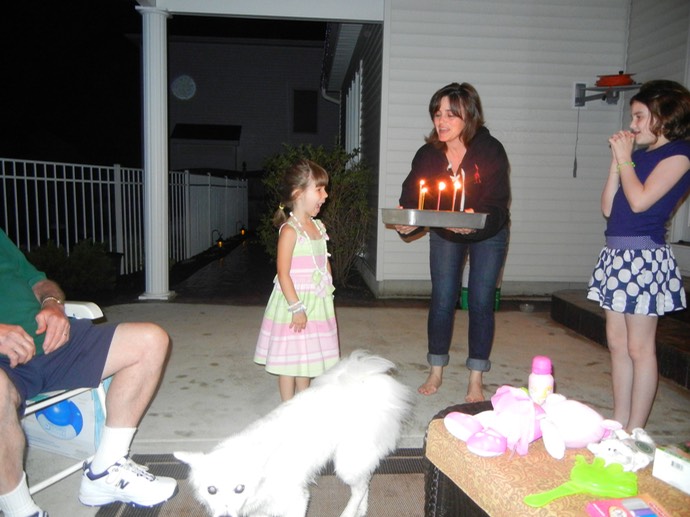 Celebrating Lilly's Birthday up in Buffalo.  Colleen holding the cake and Madelyn watching.